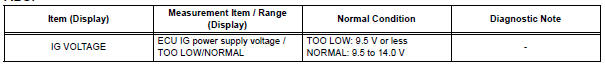 If the voltage supplied to the IG1 terminal is not within the DTC detection threshold due to malfunctions in such as the battery and alternator circuit, this DTC is stored.