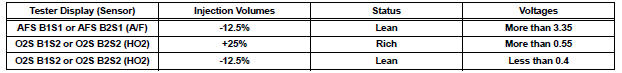 Lean: During A/F CONTROL, the A/F sensor output voltage (AFS) is consistently more than 3.35 V, and the HO2 sensor output voltage (O2S) is consistently less than 0.4 V.